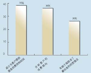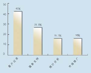 關(guān)于所應(yīng)用的CRM類型,有5家是呼叫中心,5家是分析型,7家是運(yùn)營(yíng)型,2家是屬于大型企業(yè)CRM。其中13家擁有動(dòng)態(tài)客戶數(shù)據(jù)庫(kù),占到68.4%。這其中又有42%利用數(shù)據(jù)庫(kù)作客戶記錄,26.3%作為客戶支持使用,15.7%用作統(tǒng)計(jì)分析,另有16%作為市場(chǎng)推廣。保險(xiǎn)公司與客戶聯(lián)系的方式,從重要性來(lái)看依次為:面對(duì)面\電話\網(wǎng)絡(luò)\傳真,這說(shuō)明保險(xiǎn)公司對(duì)于與客戶進(jìn)行人性化交流的重視。在問(wèn)到CRM的主要作用時(shí),有5家表示使用CRM有助于保險(xiǎn)業(yè)了解自身的經(jīng)營(yíng)情況,幫助公司準(zhǔn)確地發(fā)現(xiàn)贏利客戶和具有贏利潛力的客戶,有7家認(rèn)為使用CRM有助于分析客戶的消費(fèi)傾向,有7家認(rèn)為使用CRM有助于優(yōu)化信息和資源管理。在問(wèn)到是否愿意為像CRM系統(tǒng)這樣的咨詢或服務(wù)付費(fèi)時(shí),有11家表示愿意,占到57.8%。
