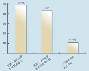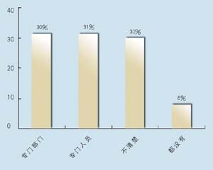 在問(wèn)到實(shí)施周期上,有9家表示希望在3個(gè)月內(nèi)完成,占到47.4%,有6家接受3~6個(gè)月的周期,超過(guò)6個(gè)月的周期已經(jīng)顯得太長(zhǎng)。在問(wèn)到CRM的實(shí)施效果上,有9家認(rèn)為對(duì)公司運(yùn)營(yíng)效率有很大提高,8家認(rèn)為作用一般,只有2家認(rèn)為沒(méi)有作用。表明基本上企業(yè)認(rèn)可CRM的作用。在問(wèn)到是否有專門人員負(fù)責(zé)CRM時(shí),有6家表示有專門部門,有6家有專門人員,合計(jì)占62%,說(shuō)明企業(yè)非常重視CRM的應(yīng)用。