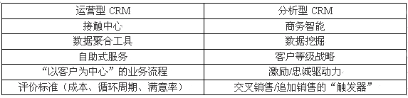 一般情況下CRM的可分為兩大類:即運營型CRM和分析型CRM。(有時把"協(xié)作型CRM"單獨作為一類)。多數(shù)情況之下運營型CRM引用的是產(chǎn)品,服務和一個企業(yè)實際能夠"照料"客戶的運做能力。關系中心,數(shù)據(jù)集合系統(tǒng)及Web站點僅僅是一些例子。分析型CRM主要指用來推動"以客戶為中心"的戰(zhàn)略和工具。商務智能系統(tǒng),數(shù)據(jù)挖掘工具及客戶層級戰(zhàn)略都可以算在這個范疇之內。