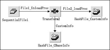 客戶信息數(shù)據(jù)庫中的各表以客戶編碼為關(guān)鍵字進(jìn)行關(guān)聯(lián),客戶編碼是由客戶的證件號碼經(jīng)過專門的算法計(jì)算產(chǎn)生的唯一客戶標(biāo)識。根據(jù)各個(gè)系統(tǒng)中客戶數(shù)據(jù)與新系統(tǒng)客戶信息的對照關(guān)系我們設(shè)計(jì)數(shù)據(jù)抽取轉(zhuǎn)換的程序,如圖4所示是一個(gè)DataStage的Job。