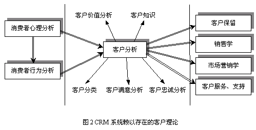 大多數(shù)CRM研究人員和應(yīng)用專(zhuān)家不認(rèn)為CRM存在作為應(yīng)用支撐的理論基礎(chǔ),充其量認(rèn)為CRM只是支持企業(yè)營(yíng)銷(xiāo)的商業(yè)策略。隨著企業(yè)追求市場(chǎng)活動(dòng)績(jī)效的熱情的提高,企業(yè)開(kāi)始采用定性和定量的分析方法決策其與市場(chǎng)和客戶有關(guān)的企業(yè)活動(dòng),如有效的客戶滿意度評(píng)價(jià)、客戶分類(lèi)、客戶盈利率分析等。而這些決策迫切需要相關(guān)的理論基礎(chǔ)為指導(dǎo),真正擺脫靠經(jīng)驗(yàn)進(jìn)行決策的做法。當(dāng)前CRM的理論研究和學(xué)術(shù)探討并未真正走向體系化、統(tǒng)一化,所以造成CRM市場(chǎng)中提供的功能參差不齊。CRM系統(tǒng)必須存在一個(gè)完整的理論體系為指導(dǎo),本文將CRM系統(tǒng)賴以存在的理論基礎(chǔ)統(tǒng)稱(chēng)為客戶理論(Theory on Customer)。