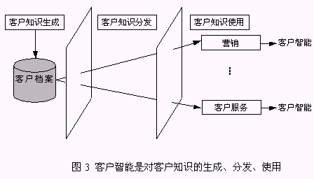 客戶知識是人們通過實踐認識到的、與客戶有關的規(guī)律性,而客戶智能是獲得客戶知識并使用客戶知識求解問題的能力?蛻糁悄苁菍ζ髽I(yè)戰(zhàn)略決策真正有價值的事物和行動?蛻糁悄懿粌H包括了客戶知識的生成,而且更強調了客戶知識在企業(yè)中的分發(fā)、使用,直到產(chǎn)生客戶智能。所以,客戶智能是對客戶知識的生成、分發(fā)和使用(圖3)。