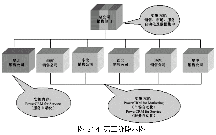 這個(gè)階段有三個(gè)小階段,即營(yíng)銷自動(dòng)化向其他機(jī)構(gòu)推廣,服務(wù)自動(dòng)化應(yīng)用開始在華北公司實(shí)施并向其他機(jī)構(gòu)推廣,公司總部的數(shù)據(jù)集中并同步實(shí)施CRM的各種業(yè)務(wù)功能。