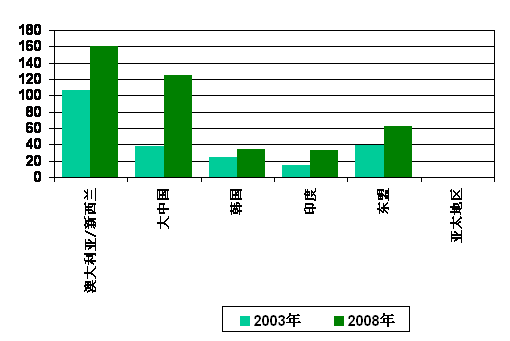 亞太區(qū)(日本除外)的CRM應(yīng)用市場(chǎng)中,澳大利亞繼續(xù)處于主導(dǎo)地位,2003年市場(chǎng)規(guī)模為9,740萬美元,據(jù)IDC預(yù)測(cè),2008年有望增至1.452億美元,未來五年的年復(fù)合增長(zhǎng)率將達(dá)到8%。中國以2,580萬美元的CRM應(yīng)用市場(chǎng)收入居其次,且IDC預(yù)測(cè),2008年的市場(chǎng)收入將達(dá)1.086億美元,未來五年的年復(fù)合增長(zhǎng)率為33%。此外,中國金融、電信等服務(wù)行業(yè)的市場(chǎng)化,迫使這些行業(yè)為了保持競(jìng)爭(zhēng)能力而增強(qiáng)CRM技術(shù)的應(yīng)用,這是CRM應(yīng)用在金融和電信行業(yè)的普及、從而帶動(dòng)中國CRM應(yīng)用市場(chǎng)迅猛增長(zhǎng)的原因。另外,進(jìn)駐中國的外資企業(yè)在CRM方面的投入也帶動(dòng)了需求的增長(zhǎng)。亞太區(qū)(日本除外)第三大CRM應(yīng)用市場(chǎng)是韓國,2003年市場(chǎng)收入約為2,500萬美元,2008年有望增至3,390萬美元,未來五年的年復(fù)合增長(zhǎng)率6%。