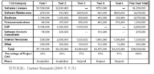 其它:這個類別涉及到上述種類中不含的TCO 成本,以便涵蓋項目評估流程期間的錯誤與疏忽部分,并作為項目執(zhí)行期間的假設(shè)與業(yè)務(wù)狀況的變化。許多公司都納入的成本實例有項目意外事故、房地產(chǎn)、附加的與正在進(jìn)行的培訓(xùn)、以及T&E 等。