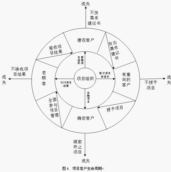 需要特別注意的一點是,在項目的整個生命周期中,如果客戶不滿意項目組織提供的服務(wù),將會離開項目組織,造成客戶流失。