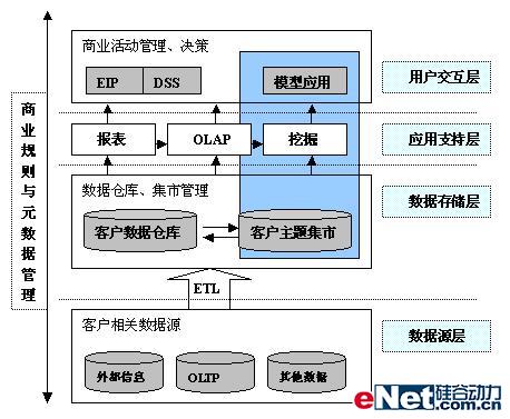 從上面的分析型CRM體系結(jié)構(gòu)圖可以看出,整個(gè)架構(gòu)分為數(shù)據(jù)源層、數(shù)據(jù)存儲(chǔ)層、應(yīng)用支持層和用戶交互層總共四層。數(shù)據(jù)源層包括了企業(yè)常用信息系統(tǒng)和一些外部系統(tǒng)的數(shù)據(jù)源,比如涉及到客戶交互的一些交易系統(tǒng),服務(wù)系統(tǒng),各系統(tǒng)間的客戶數(shù)據(jù)是分散的,而且可能重合,出現(xiàn)不一致的問題;數(shù)據(jù)存儲(chǔ)層是為了整個(gè)企業(yè)有集中統(tǒng)一的客戶視圖,通過從各源系統(tǒng)抽取數(shù)據(jù),進(jìn)行整合后的數(shù)據(jù)倉庫,而且在客戶數(shù)據(jù)倉庫的基礎(chǔ)上,可以建立相關(guān)分析之用的客戶主題數(shù)據(jù)集市;應(yīng)用支持層除了支持復(fù)雜,智能化報(bào)表查詢外,還支持OLAP分析,提供數(shù)據(jù)挖掘功能;用戶交互層提供分析和挖掘結(jié)果同企業(yè)管理、決策層和企業(yè)其它服務(wù)人員和客戶的交互,形成反饋機(jī)制,從而有效地利用分析和挖掘得到的有用知識(shí)。