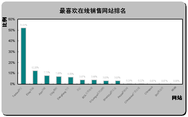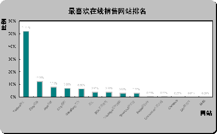 易趣中國(guó)和貝塔斯曼最不受歡迎。從最不喜歡在線(xiàn)銷(xiāo)售網(wǎng)站排名(如上圖)可以看出,易趣中國(guó)eBay