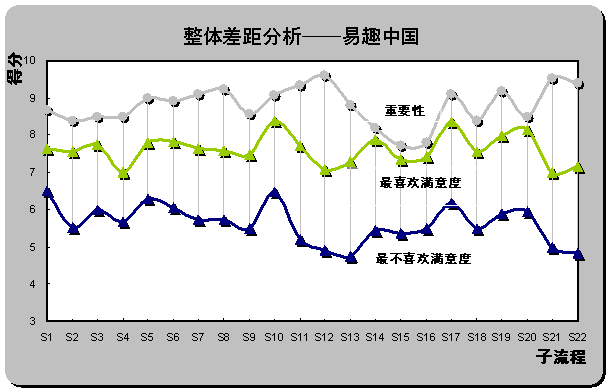 2) 重要流程欠缺最優(yōu)體驗(yàn)。雖然易趣中國(guó)被認(rèn)為是最不喜歡的在線(xiàn)銷(xiāo)售網(wǎng)站,但從滿(mǎn)意度評(píng)分也同時(shí)可以發(fā)現(xiàn),易趣中國(guó)在S1(瀏覽速度),S16(個(gè)人定制促銷(xiāo)信息的發(fā)布)和S15(個(gè)性化頁(yè)面設(shè)置)還是為用戶(hù)設(shè)計(jì)了相對(duì)較好的體驗(yàn)。但重要性得分排名前三位的子流程中,S12(產(chǎn)品質(zhì)量可靠)、S21(退換貨服務(wù))和S22(客戶(hù)投訴和反饋)仍為重要性與滿(mǎn)意度差距最大的三個(gè)子流程,易趣中國(guó)也未在重要流程上為用戶(hù)設(shè)計(jì)優(yōu)越的在線(xiàn)體驗(yàn)。