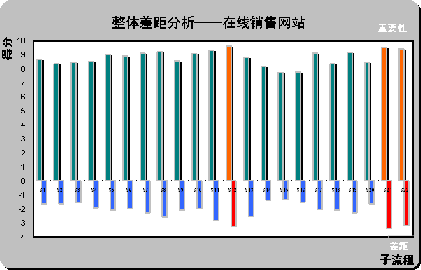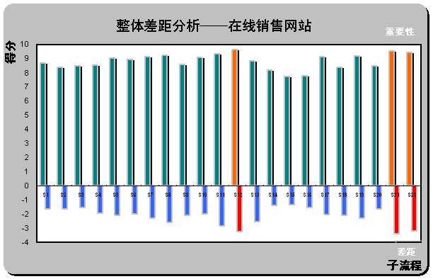 。2)整體差距分析(Gap Analysis)。請(qǐng)見(jiàn)上圖X軸下方所示,計(jì)算所有被調(diào)查對(duì)所列在線(xiàn)銷(xiāo)售網(wǎng)站的滿(mǎn)意度平均值(綜合最喜歡在線(xiàn)銷(xiāo)售網(wǎng)站和最不喜歡在線(xiàn)銷(xiāo)售網(wǎng)站的滿(mǎn)意度,計(jì)算被調(diào)查者對(duì)22個(gè)子流程的滿(mǎn)意度評(píng)分)。通過(guò)計(jì)算重要性和滿(mǎn)意度的差距,首先,一個(gè)有趣的現(xiàn)象,在著色的三個(gè)差距最大的子流程剛好也是重要性得分排名前三位的流程S12,