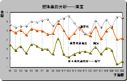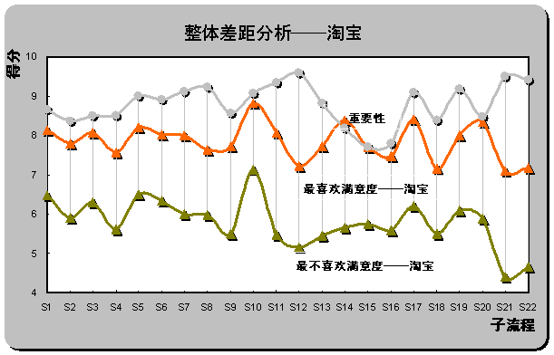 S12(產(chǎn)品質(zhì)量可靠)和S22(客戶(hù)投訴和反饋),具體差距分別為2.44,2.38和2.22。也是重要性評(píng)分排名前三位的子流程。雖然淘寶成為用戶(hù)最喜歡的在線(xiàn)銷(xiāo)售網(wǎng)站,但在重要子流程上并未為用戶(hù)設(shè)計(jì)最佳體驗(yàn)。