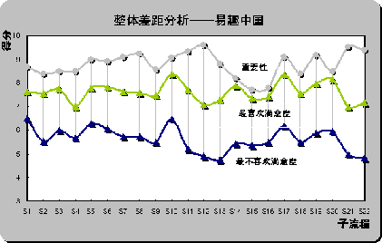從前面分析可知,易趣以19.77%的比例成為最不喜歡在線(xiàn)銷(xiāo)售網(wǎng)站,選擇被調(diào)查者對(duì)子流程評(píng)分——最喜歡、最不喜歡在線(xiàn)銷(xiāo)售網(wǎng)站滿(mǎn)意度曲線(xiàn)與重要性曲線(xiàn)進(jìn)行差距分析。