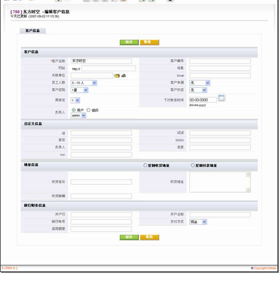 易客采用的窗口切換方式類似于Salesforce,在Ajax大行其道的今天,不能不說(shuō)這種方式的落后。不過(guò)令人欣慰的是,易客在客戶信息被保存后,修改個(gè)別字段時(shí)大量運(yùn)用了Ajax技術(shù),十分方便。這部分細(xì)節(jié)我們放在維護(hù)客戶部分描述。