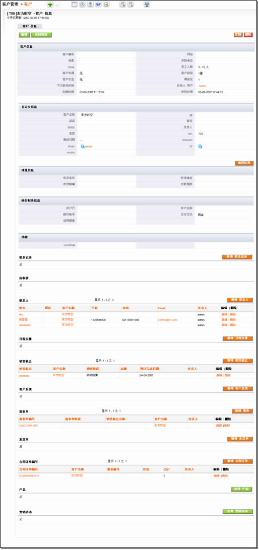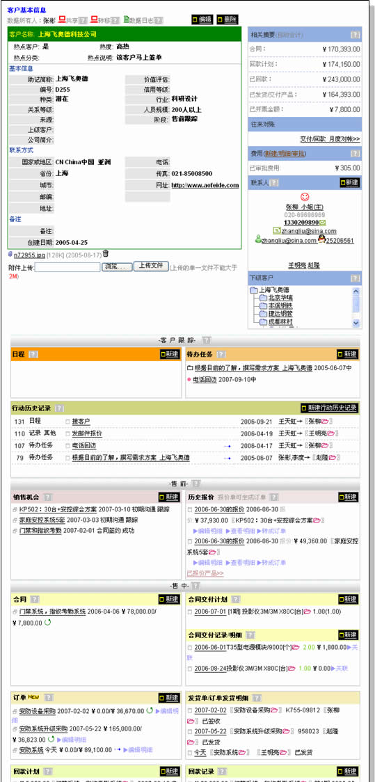 從其視圖的內(nèi)容結(jié)構(gòu)上,分為客戶基本信息、統(tǒng)計(jì)信息、聯(lián)系人;跟蹤;售前(銷售機(jī)會(huì)、報(bào)價(jià));售中(合同、訂單、回款發(fā)票);售后(服務(wù)投訴)。應(yīng)該說(shuō)比較完整地涵蓋了客戶跟蹤和維護(hù)的全部過(guò)程。