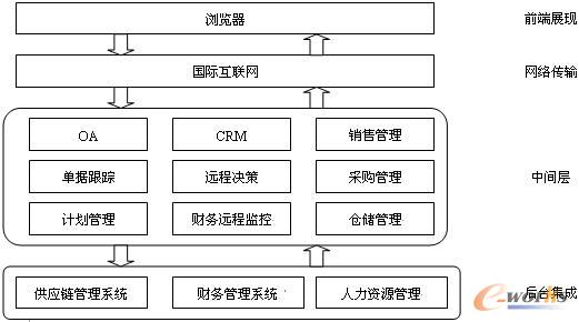 前端:瀏覽器,也叫企業(yè)門戶,可通過類似瀏覽網(wǎng)頁的形式登陸系統(tǒng),不受具體終端類型的限制;
