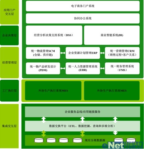 根據(jù)企業(yè)管理發(fā)展戰(zhàn)略及目標(biāo),需要考慮建設(shè)“集成化數(shù)字管控制造系統(tǒng)”,涵蓋企業(yè)決策層、企業(yè)經(jīng)營(yíng)管理層。根據(jù)整體業(yè)務(wù)模式,企業(yè)經(jīng)營(yíng)管理層又可以進(jìn)一步分解為公司管理層和工廠(chǎng)執(zhí)行層;從信息化戰(zhàn)略支撐角度可以分解為企業(yè)門(mén)戶(hù)交互層、應(yīng)用系統(tǒng)層、應(yīng)用集成層和網(wǎng)絡(luò)支撐層。實(shí)現(xiàn)企業(yè)信息流、資金流、物流、商物流的高度集成、統(tǒng)一,為企業(yè)生產(chǎn)、經(jīng)營(yíng)提供強(qiáng)有力的信息化支撐。