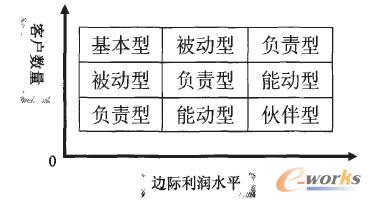 這5種類型之間并不具有簡單的優(yōu)劣對比或順序,因為企業(yè)所采用的客戶關系類型取決它的產(chǎn)品以及客戶的特征,不同企業(yè)甚至同一企業(yè)在對待不同客戶時,都有可能采用不同的客戶類型。一家生產(chǎn)日用化妝品的企業(yè),與它的化妝品消費者個人之間常會建立一種被動型的客戶關系,企業(yè)設立的客戶服務機構或聯(lián)絡中心將聽取客戶的意見,處理客戶投訴以及改進產(chǎn)品;但這家企業(yè)同大型超市或零售企業(yè),同連鎖的美容產(chǎn)業(yè)機構之間,常可能建立一種伙伴型的客戶關系,實現(xiàn)產(chǎn)銷企業(yè)之間的互惠互利?铺乩仗岢觯髽I(yè)可以根據(jù)其客戶的數(shù)量以及產(chǎn)品的邊際利潤水平,根據(jù)圖3指示的思路,選擇合適的客戶關系類型。