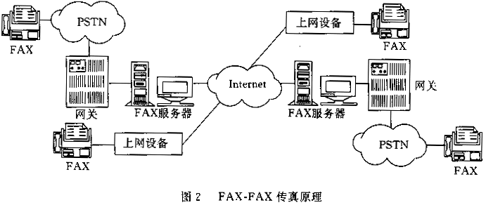 發(fā)送端傳真機(jī)與網(wǎng)關(guān)連接,通過(guò)PSTN傳送傳真,網(wǎng)關(guān)接收傳真后通過(guò)Internet傳至另一端的網(wǎng)關(guān),另一端的網(wǎng)關(guān)再通過(guò)PSTN將傳真發(fā)送給接收端傳真機(jī)。這種方式既適合存儲(chǔ)轉(zhuǎn)發(fā)模式,也適合實(shí)時(shí)模式,因此更加有吸引力。近年來(lái),出現(xiàn)了一種不依賴網(wǎng)關(guān)的FAX-FAX IP傳真技術(shù),它是利用傳真機(jī)外掛一專用上網(wǎng)設(shè)備直接在Internet網(wǎng)上發(fā)送信息,原理如圖2所示。
