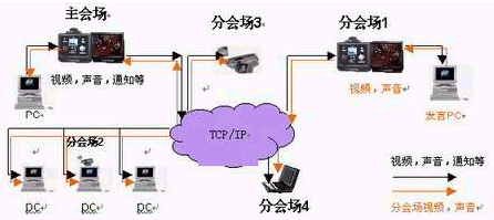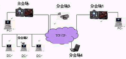 會(huì)議的組織,召開(kāi),管理由主會(huì)場(chǎng)來(lái)完成。因此,主會(huì)場(chǎng)的視頻,聲音,通知,指示,下達(dá)的文件資料各分會(huì)場(chǎng)都應(yīng)該收到。當(dāng)某分會(huì)場(chǎng)發(fā)言時(shí),其視頻,聲音同樣要傳送給其他會(huì)場(chǎng)。(如下圖所示)上述所有動(dòng)作的完成依賴(lài)組播技術(shù)。通過(guò)組播技術(shù)把主會(huì)場(chǎng)的各種數(shù)據(jù)發(fā)送到參加會(huì)議的分會(huì)場(chǎng)中,而且把發(fā)言分會(huì)場(chǎng)的視音頻數(shù)據(jù)發(fā)送給其他會(huì)場(chǎng):即主會(huì)場(chǎng)和發(fā)言分會(huì)場(chǎng)的各種數(shù)據(jù)只要在網(wǎng)上發(fā)送一次,其他會(huì)場(chǎng)都將收到此數(shù)據(jù),(這就是有別于點(diǎn)對(duì)點(diǎn)通信方式的地方)而與這兩個(gè)會(huì)場(chǎng)在同一網(wǎng)段卻不參加會(huì)議的非成員不會(huì)收到數(shù)據(jù)(只要設(shè)備支持,這也是有別于廣播的地方)。因此,當(dāng)會(huì)議成員增加時(shí),不會(huì)產(chǎn)生信息傳輸量劇增,帶來(lái)無(wú)法忍受的網(wǎng)絡(luò)延時(shí)和抖動(dòng)。