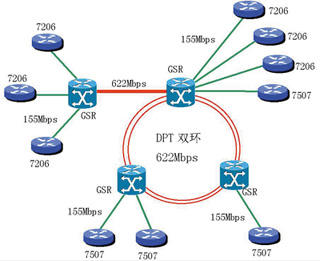 GSR12008是電信營運級的高端交換路由器,在這里主干之間用DPT的622Mbps的IP光纖傳輸接口相互兩兩連接成SRP雙環(huán)。