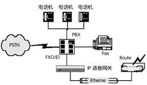 在這種應(yīng)用方式中, IP語(yǔ)音網(wǎng)關(guān)采用FXO接口與PBX(用戶電話交換機(jī))互連,電話直接接入PBX,未接入PBX的外部電話,經(jīng)電話公網(wǎng)(PSTN)與PBX相連。