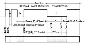 圖5所示的是丟包測試的時序圖, 圖中的語音路由測試信號即為“Golden Voice”產(chǎn)生的復(fù)合語音信號。在測試中,用戶可以自行設(shè)定分別為5ms、10ms、15ms、25ms、50ms或100ms檢測門限值。