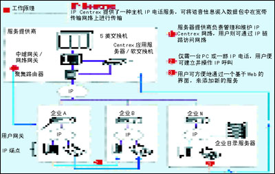 IP Centrex包含了大量能向企業(yè)提供語(yǔ)音業(yè)務(wù)的IP電話服務(wù),他可將呼叫裝入數(shù)據(jù)包中在寬帶傳輸網(wǎng)絡(luò)上傳送,而一個(gè)寬帶傳輸網(wǎng)絡(luò)可被用來(lái)承載多個(gè)呼叫的語(yǔ)音數(shù)據(jù)。在工作時(shí),如果某個(gè)呼叫還沒(méi)有激活,那么將會(huì)有更多的帶寬分配到高速數(shù)據(jù)會(huì)話中(high-speed