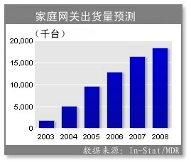 In-Stat/MDR分析師Mike Wolf說(shuō),未來(lái)5年家庭網(wǎng)關(guān)市場(chǎng)將推動(dòng)寬帶CPE市場(chǎng)增長(zhǎng)。市場(chǎng)將從2004年出貨低于500萬(wàn)臺(tái)增長(zhǎng)到2008年超過(guò)1800萬(wàn)臺(tái),年增長(zhǎng)率30%。