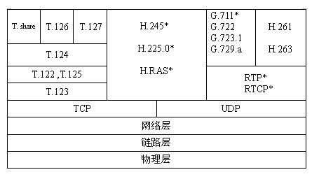 為網(wǎng)絡(luò)電話和可視電話會議系統(tǒng)的進(jìn)一步發(fā)展和系統(tǒng)的兼容性提供了良好的條件。其中系統(tǒng)控制協(xié)議包括H.323、H.245、和H.225.0,Q.931和RTP/RTCP是H.225.0的主要組成部份。系統(tǒng)控制是H.323終端的核心。整個系統(tǒng)控制由H.245控制信道、H.225.0呼叫信令信道和RAS(注冊、許可、狀態(tài))信道提供,音頻編解碼協(xié)議包括G.711協(xié)議(必選)、G.722、G.723.1、G.728、G.729等協(xié)議。編碼器使用的音頻標(biāo)準(zhǔn)必須由H.245協(xié)議協(xié)商確定。H.323終端應(yīng)由對本身所具有的音頻編解碼能力進(jìn)行非對稱操作。如以G.711發(fā)送,以G.729接收。視頻編解碼協(xié)議主要包括H.261協(xié)議(必選)和H.263協(xié)議。H.323系統(tǒng)中視頻功能是可選的。數(shù)據(jù)會議功能也是可選的,其標(biāo)準(zhǔn)是多媒體會議數(shù)據(jù)協(xié)議T.120。其結(jié)構(gòu)如圖所示。