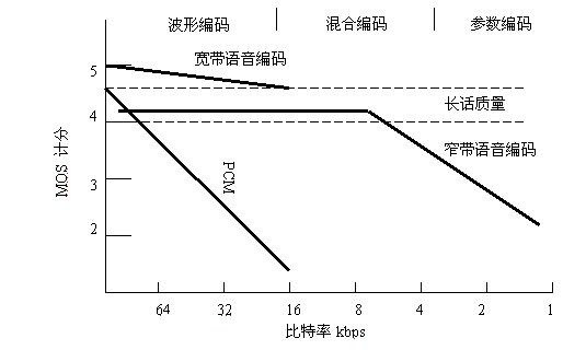 長話質(zhì)量編碼器在比特率高于8Kbps時(shí)容易實(shí)現(xiàn),如圖4-2所示。長話質(zhì)量的語音平均意見得分(MOS)必須在分或許分以上。傳統(tǒng)的PCN語音在比特率小于32