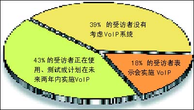 該調(diào)查收集了全球254名高級管理人員對未來企業(yè)網(wǎng)絡(luò)的意見和看法。其中,43%的受訪者表示,他們正在使用、測試或計(jì)劃在未來兩年內(nèi)實(shí)施VoIP;另外 18% 的受訪者表示,從長遠(yuǎn)的角度來講,他們會(huì)實(shí)施 VoIP。市場預(yù)測也顯示相同的樂觀前景。研究機(jī)構(gòu)Gartner Dataquest預(yù)期到2008年,公用電話交換網(wǎng) (PSTN) 的零售語音收入將輕微下跌,而VoIP的零售收入則上升 38.6%。