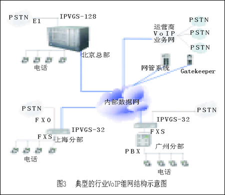 我國現(xiàn)有很多擁有自己專網(wǎng)的行業(yè),比如金融、能源和一些政府機(jī)構(gòu),它們正是通過這樣的方案來實(shí)現(xiàn)內(nèi)部通話的。這些行業(yè)目前也正是中國VoIP市場的主力,由于行業(yè)用戶的規(guī)模很大,目前中國的很多行業(yè)實(shí)際上都有一套運(yùn)營級的VoIP網(wǎng)絡(luò)。圖3是一個(gè)典型的行業(yè)VoIP組網(wǎng)結(jié)構(gòu)圖。