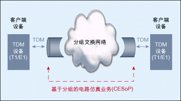 CESoP的基本思想就是在分組交換網(wǎng)絡(luò)上搭建一個(gè)“通道”,在其中實(shí)現(xiàn)TDM電路(如T1或E1),從而使網(wǎng)絡(luò)任一端的TDM設(shè)備不必關(guān)心其所連接的網(wǎng)絡(luò)是否是一個(gè)TDM網(wǎng)絡(luò)。分組交換網(wǎng)絡(luò)被用來仿真TDM電路的行為,故而稱為“電路仿真”(圖1)。