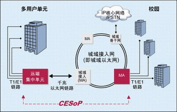 對(duì)于擁有眾多用戶的樓宇或校園業(yè)務(wù),運(yùn)營商可能需要在靠近客戶的地方裝設(shè)遠(yuǎn)端集中器。遠(yuǎn)端集中器集中提供給該樓宇內(nèi)客戶的TDM和/或分組業(yè)務(wù),使用電路仿真并通過點(diǎn)到點(diǎn)連接將業(yè)務(wù)傳回最近的城域網(wǎng)絡(luò)接入點(diǎn)。