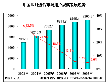即時通訊巨大的市場價值主要來自三方面,除了能夠增加門戶網(wǎng)站的用戶的黏性,即時通訊能夠帶來巨大的用戶和網(wǎng)絡(luò)通訊巨大的市場。根據(jù)計(jì)世資訊《2005-2006年中國VoIP業(yè)務(wù)發(fā)展趨勢研究報告》相關(guān)數(shù)據(jù)顯示,2005年中國即時通訊用戶達(dá)到7362.1萬人,增長率為18.5%,2005年中國即時通訊市場規(guī)模達(dá)到16.2億元,實(shí)現(xiàn)37.3%的增長率。