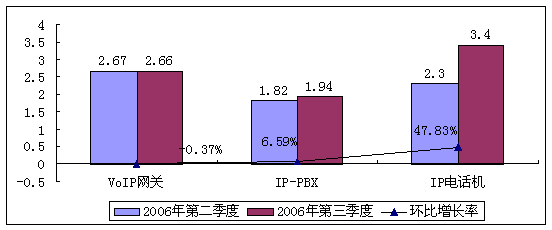 2006年國內(nèi)傳統(tǒng)電信運(yùn)營商已經(jīng)逐步開始進(jìn)入到NGN及新一代VoIP業(yè)務(wù)的實質(zhì)性網(wǎng)絡(luò)建設(shè)階段,并且隨著企業(yè)對VoIP理解的加深及控制成本的考慮,大型企業(yè)CIO對VoIP的接納態(tài)度正在向好。在中小型企業(yè)市場,由于企業(yè)對通信成本更加敏感,但受VoIP設(shè)備技術(shù)成熟及價格下降這些因素的影響,這一市場也在迅速升溫。這些都促使VoIP設(shè)備在2006年開始進(jìn)入實際購買階段,促進(jìn)了VoIP設(shè)備規(guī)模增長。2006年第二季度國內(nèi)VoIP設(shè)備市場收入為6.79 億人民幣,與第一季度同比增長率為19.96%,整體市場保持穩(wěn)定增長。從中國VoIP設(shè)備產(chǎn)品市場結(jié)構(gòu)(銷售額劃分)來看,VoIP網(wǎng)關(guān)占39.2%,IP-PBX占26.9%,IP電話機(jī)占33.9%。