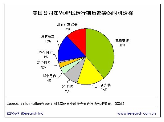 iResearch艾瑞市場咨詢整理《InformationWeek》對320位商業(yè)科技專家進行的VoIP調(diào)研數(shù)據(jù)顯示,美國有近四成的公司在VoIP試運行期后安裝了VoIP,正在安裝的也達到了一成以上,打算在6個月以內(nèi)安裝的有近一成。