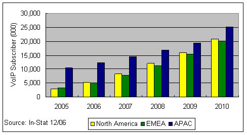 應(yīng)該說(shuō)在2006年,VoIP技術(shù)已經(jīng)不是阻礙其市場(chǎng)發(fā)展的主要因素,因?yàn)镮n-Stat在全球個(gè)人VoIP消費(fèi)市場(chǎng)中作的調(diào)查顯示,約9%的VoIP用戶甚至不清楚自己在使用IP傳輸;有64%的用戶在使用免費(fèi)的VoIP服務(wù)。其次有超過(guò)73%的用戶并不把是否使用IP技術(shù)當(dāng)成選擇該業(yè)務(wù)的影響因素。而寬帶接入市場(chǎng)的競(jìng)爭(zhēng)則構(gòu)成了VoIP發(fā)展的關(guān)鍵因素,作為一種寬帶應(yīng)用,誰(shuí)的接入資源占據(jù)了用戶家庭,誰(shuí)就可以決定是否采用VoIP技術(shù)來(lái)提供語(yǔ)音業(yè)務(wù)。在歐洲法國(guó)Free Telecom與意大利的FastWeb都是三重播放業(yè)務(wù)的積極推進(jìn)者,在VoIP市場(chǎng)居領(lǐng)先地位;在日本Yahoo!BB擁有亞洲地區(qū)50%的寬帶VoIP用戶。幾乎所有這些寬帶ISP提供商往往采用包月的形式或者以極低的費(fèi)用提供無(wú)限制的本地或國(guó)內(nèi)通話,在國(guó)際長(zhǎng)途電話上提供極大的折扣。