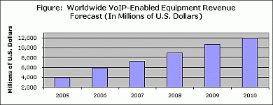 2006年11月?lián)y(tǒng)計(jì),全球VoIP設(shè)備銷售收入將從2005年的39.5億美元增長到2010年的119億美元,年度復(fù)合增長率為24.7%。如下圖所示。VoIP市場主要包括三個(gè)用戶群:用于企業(yè)的專用電話交換機(jī)(PBX),服務(wù)供應(yīng)商的基礎(chǔ)架構(gòu)以及住宅接入設(shè)備。