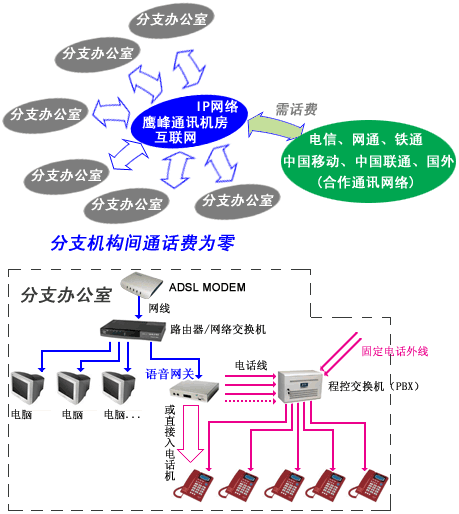 針對以上現(xiàn)狀,鷹峰NGN組網(wǎng)方案協(xié)助A公司在中國總部進(jìn)行了周密的分析與考察并就相關(guān)的產(chǎn)品技術(shù)進(jìn)行了深入的研究與探討,提供了以A公司在中國現(xiàn)有數(shù)據(jù)專網(wǎng)為基礎(chǔ)的,融合語音通信的解決方案,這是一套充分利用A公司現(xiàn)有數(shù)據(jù)網(wǎng)絡(luò)資源優(yōu)勢,可行、先進(jìn)、完整的企業(yè)VoIP通信解決方案。將最終以A公司目前在中國所有機(jī)構(gòu)為結(jié)點(diǎn),組成在中國的VoIP網(wǎng)絡(luò)。方案匯集了鷹峰通訊所有最新PBX/語音網(wǎng)關(guān)及網(wǎng)絡(luò)通訊技術(shù)及設(shè)備,保護(hù)了原有的交換機(jī)資源,不改變撥號習(xí)慣,體現(xiàn)了非?捎^的經(jīng)濟(jì)效益,并且實(shí)現(xiàn)了快速實(shí)施,將投入的時(shí)間,資金縮到了最小。
