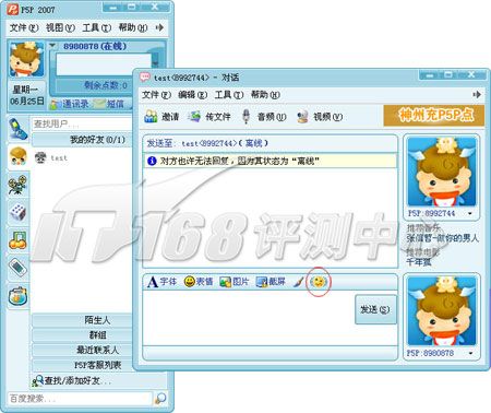 P5P和酷寶很類似,不過(guò)它沒有集成MSN,僅是在界面上模仿MSN,文本聊天框就是MSN翻版,MSN經(jīng)典的閃屏震動(dòng)功能也有。P5P還在在好友列表上加進(jìn)了一些QQ的元素。
