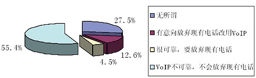 最近《華爾街日?qǐng)?bào)》刊載了YankeeGroup公司的調(diào)查報(bào)告,對(duì)美國人使用VoIP的趨向和目前的一些應(yīng)用狀況進(jìn)行了統(tǒng)計(jì),重點(diǎn)調(diào)查了美國人是否要放棄傳統(tǒng)的固定電話而改用VoIP,具體數(shù)據(jù)參見圖1。從圖中可見人們對(duì)放棄固定電話而改用VoIP的意向還不是很高,但已使用VoIP的人群卻是個(gè)龐大的群體,使用VoIP的人口比例已達(dá)15.1%,現(xiàn)使用人數(shù)已達(dá)到了4500多萬戶,具體見表1。另外,目前美國VoIP已從暴利行業(yè)轉(zhuǎn)向微利行業(yè),這點(diǎn)可以從Skype公司收入得到證明,詳見表2。