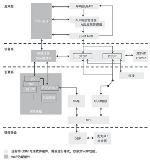 藍(lán)色方塊表示現(xiàn)有平臺(tái)的新應(yīng)用,包括網(wǎng)絡(luò)傳輸協(xié)議、核心控制VoIP應(yīng)用。由于支持GPRS功能的每部移動(dòng)電話都應(yīng)該帶有TCP/UDP