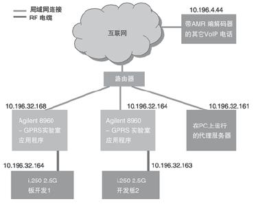 8960 ,將GRPS實(shí)驗(yàn)室應(yīng)用測(cè)試集用作媒介,將 i.250 2.5G 開(kāi)發(fā)板卡 (ADS板卡)連接到互聯(lián)網(wǎng)。ADS板卡在接通電源時(shí),注冊(cè)登錄到GPRS網(wǎng)絡(luò),測(cè)試集然后通過(guò)路由器連接到互聯(lián)網(wǎng)。測(cè)試集充當(dāng)連接到GPRS的DUT的橋梁,讓它們接入互聯(lián)網(wǎng)。一旦GPRS上下文激活,測(cè)試集將為ADS分配一個(gè)固定IP地址。此外,在PC上運(yùn)行的代理服務(wù)器也連接到同一個(gè)路由器。通過(guò)這種安排,確保三個(gè)實(shí)體都能在同一網(wǎng)段內(nèi)運(yùn)行。這樣就能對(duì)同一個(gè)網(wǎng)段內(nèi)的分組流量進(jìn)行監(jiān)控,用于開(kāi)發(fā)目的。