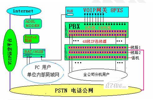 如果現(xiàn)有網(wǎng)絡接入方式為ADSL寬帶撥號上網(wǎng),全公司共享上網(wǎng)使用,如果想要支持超過4人以上同時通話,為了使數(shù)據(jù)和語音互相不爭用帶寬,必須考慮另外申請一條ADSL。下圖為PBX、VOIP、選路器接線圖: