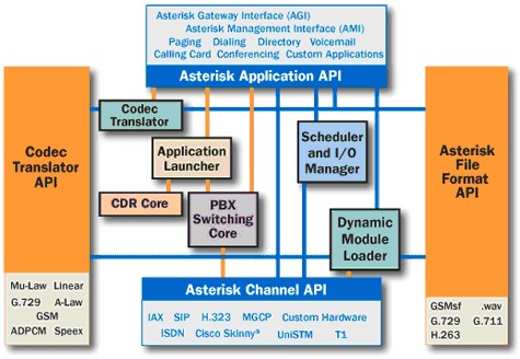 Asterisk具有傳統(tǒng)PBX無法比擬的優(yōu)點,那就是其靈活性,可擴(kuò)展能力;Asterisk的擴(kuò)展能力是通過開放相應(yīng)的架構(gòu)和接口來實現(xiàn)的。這就意味著Asterisk是一個組件而不是一個成型的產(chǎn)品,Asterisk的核心提供了一個基本的可運行環(huán)境,而外圍相應(yīng)的能力則可以通過加載和配置相關(guān)的插件和模塊來實現(xiàn)。