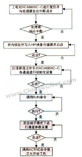 主要是基于嵌入式arm處理器,通過hpi接口實現(xiàn)對ac4880xc-c及相關芯片的讀寫操作。流程圖如圖5所示: