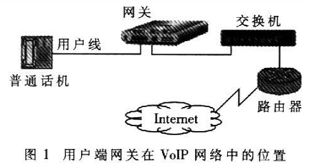 近年來(lái)隨著寬帶網(wǎng)絡(luò)和IP技術(shù)的日益發(fā)展,VoIP>(Volee over Internet Protoc01)技術(shù)的應(yīng)用越來(lái)越廣泛。網(wǎng)關(guān)是VoIP網(wǎng)絡(luò)中的重要設(shè)備,按照應(yīng)用領(lǐng)域可分為電信級(jí)網(wǎng)關(guān)和用戶端網(wǎng)關(guān)。用戶端網(wǎng)關(guān)設(shè)備主要應(yīng)用于小區(qū)和企業(yè),是連接終端電話和IP網(wǎng)絡(luò)的橋梁,主要功能是進(jìn)行語(yǔ)音編解碼、信令處理、VoIP協(xié)議處理和路由協(xié)議處理等。用戶端網(wǎng)關(guān)設(shè)備在VoIP網(wǎng)絡(luò)中的位置如圖1所示。可以看出,網(wǎng)關(guān)處于用戶電話線路部分的末端、IP網(wǎng)絡(luò)部分的起始端。
