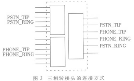 為了有效利用資源,系統(tǒng)使用三相轉(zhuǎn)接頭將電話線路與PSTN線路組合到一個(gè)RJ11接口上,每路話路使用一個(gè)三相轉(zhuǎn)接頭。三相轉(zhuǎn)接頭的連接方式如圖3所示。