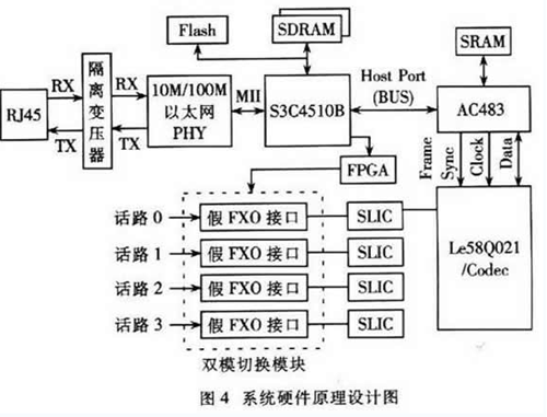本節(jié)提出了一種基于H.323的雙模網(wǎng)關(guān)的系統(tǒng)設(shè)計(jì)方案,該方案支持4路話音,使用一種經(jīng)濟(jì)實(shí)用的“假FXO接口”方式實(shí)現(xiàn)雙模切換,能夠在VoIP通話時(shí)檢測(cè)到PSTN線上進(jìn)來(lái)的呼叫并可通過(guò)按話機(jī)的拍簧或者Flash閃斷鍵切換接聽(tīng)。